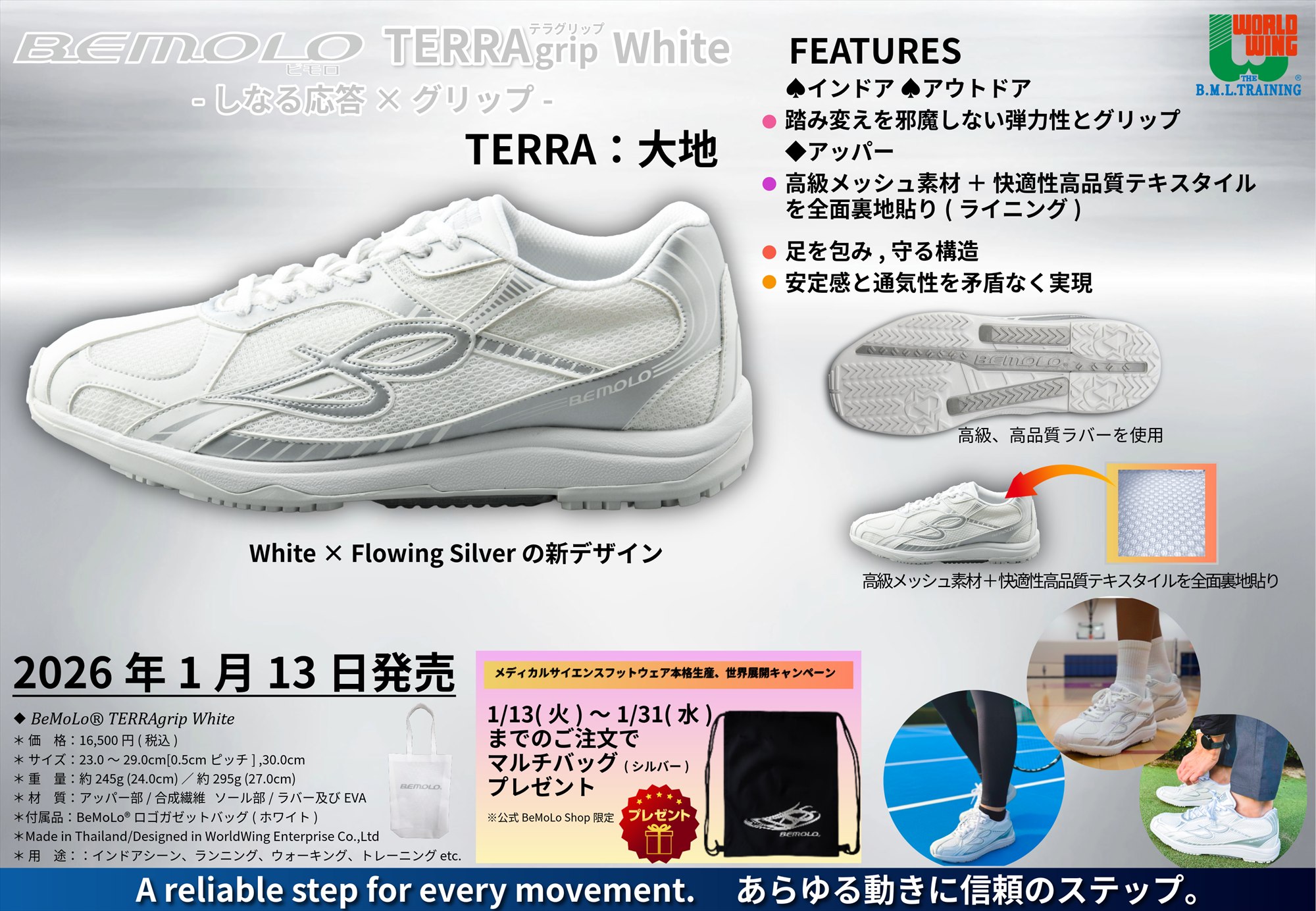 ★★メメディカルサイエンスフットウェア本格生産。世界展開キャンペーンⅡ★★2026年1/13~1/31までのご注文で「オリジナルマルチバッグプレゼント」♥BeMoLo®TERRA