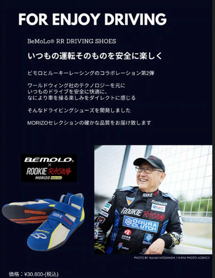 初動負荷理論 ® の創案と具現化マシン、そして『高機能シューズ・BeMoLo』の発明で世界に知られる神経筋生理学者・小山裕史博士と、 ルーキーレーシング株式会社代表取締役でドライバーでもある豊田章男、 両者の共同・協業製作の初プロジェクト 『ビモロ・RR』シリーズ。